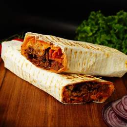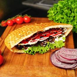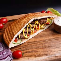 Хрустящая лепешка с увеличенной порцией шашлыка из фарша , овощами и соусом