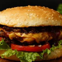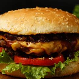 Свежая булочка, две говяжьи котлеты, лист салата, помидор, огурчик, фирменный соус