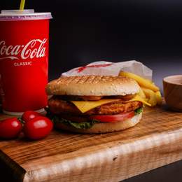 Свежая булочка, говяжья котлета, лист салата, сыр, помидор, огурчик, фирменный соус