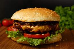 Свежая булочка, две говяжьей котлеты,сыр,лист салата,соленые огурцы,помидоры и соус