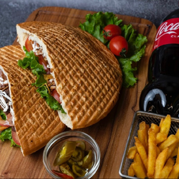 2 шт. лаваш куриный 2 шт. лаваш говяжий 3 порции картофеля фри 2 шт. Coca-cola 1 л. 2 шт. перчик халапеньо