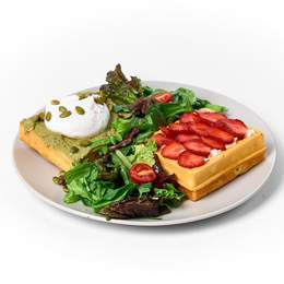 Микс: вафли с авокадо и яйцом пашот, вафли с фирменным кремом и ягодами.