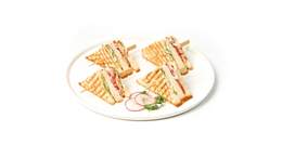 Большой итальянский сэндвич – блюдо, на основе хлебного багета, с куриной грудкой, листьев айсберга, свежих томатов и огурцов, с авторским соусом. К сэндвичу подается картофель фри