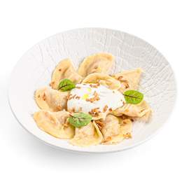 Вареники с картофелем. сметана, жареный лук, оливковое масло