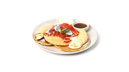 Панкейки с шоколадной пастой - мучное изделие плоской формы, выпекаемое на сковороде, в порции 3 штуки, подаются рядом: шоколадная паста, банан и ягоды, посыпан сахарной пудрой