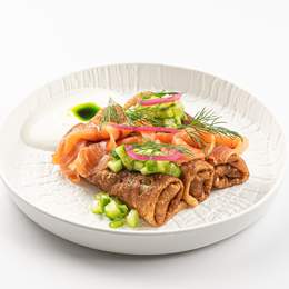 Блинчики начиненные кремчизом с зеленью, подаются с слабосоленой семгой , тар-таром из огурца и маринованным луком.
