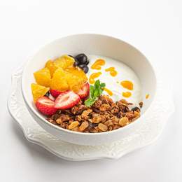 Печеные овсяные хлопья с орехами , цукатами и медом. Греческий йогурт политый соусом из манго и сезонными ягодами