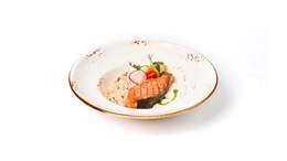 Филе семги с булгуром – запечённая филе семги, собственном соку, подается с гарниром на основе высушенной, дробленой пшеницы – булгур, с болгарским перцем светофор в сливочном соусе и помидорами черри