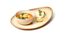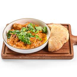 Куринные кусочки, соус том ям, сливки, молоко кокосовое, кинза, пита