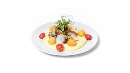 Обжаренная куриная грудка в панировке с соусом тар-тар . Подается с рукколой заправленной лимонными дрессингом