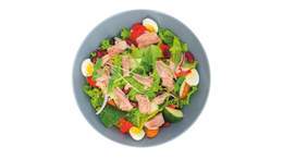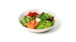 Микс-боул - это восточное блюдо, состоящее из полезных продуктов таких, как свежие огурцы, редиски, помидоров черри, зеленого горошка, твороженный сыр, тыквенные семечки, авокадо и листья салата, подается с семгой