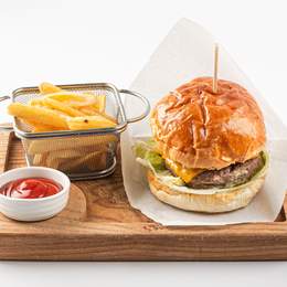 Фирменный бургер с нежной котлетой из говядины , маринованным огурцом , томатом и айсбергом . С добавлением двух видов соусов тар- тар и трюфельного соуса . Подается с картофельными дипперами и кетчупом