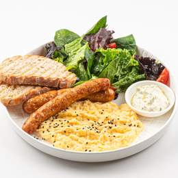 Скрэмбл из трех яиц, две куриные колбаски, микс салат и чиабатта
