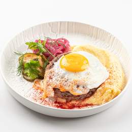 Сочная говяжья котлета с картофельным пюре и яйцом глазунья . Подается с огурцами ким чи, помидором и маринованным луком.