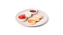 Домашние сырники - пышные горячие сырники из творога, в порции 3 штуки, подаются вместе с сезонными ягодами, малиновый джем и фирменным кремом