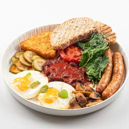 Глазунья из двух яиц с авторской колбаской, картофельным хашбрауном , фасолью в томатном соусе ,свежим томатом , огурцом ким-чи ,обжаренными грибами и свежим миксом зелени . Подается с хлебом чиабатта .