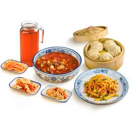 Суйру лагман, жареный картофель с курицей, манты с мясом 5шт, компот 1л. Внешний вид может отличаться от иллюстраций.