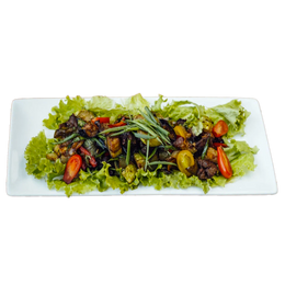 говяжий антрикот,баклажаны,кабачки,перец болгарский,зелень,помидоры черри,заправляется соевым соусом
