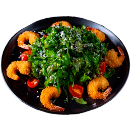 креветки,рукола,помидоры черри,лимон,листья салата,сыр пармезан,заправлен лимонным соком