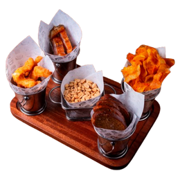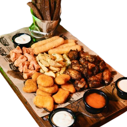 куриные наггетсы,сосиски молочные, куриные крылышки, картофельные дольки, сырные палочки, чесночные гарлики, соус: тар тар, чесночный, сырный, чили