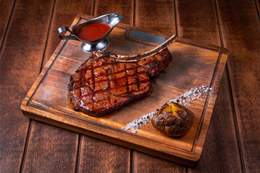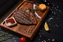 рибай на кости,подается с запеченым картофелеи и соусом барбекю