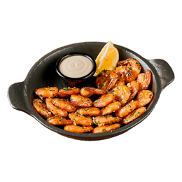 креветки обжареные в растительном масле с чесноком и лимоном посыпаные зеленью петрушки и укропа,подаются с соусом Цезарь , (15-18шт)