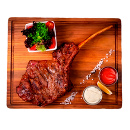 фирменный томагавк,подается с миксом салата из листьев салата,помидоров черри с долькой лимона,соусом тар тар и чили