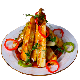 баклажаны,перец полугорький,микро зелень,кисло сладкий соус