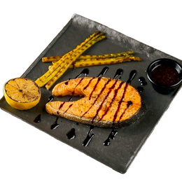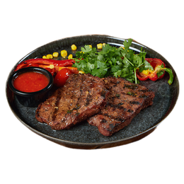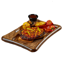 говяжья вырезка,подается с соусом барбекю и гарниромиз запеченый овощей-початоккукурузы,картофель,помидор,дунганский перец и шампиньоны