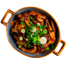 говяжья вырезка,поданная на тостерном хлебе,покрытая соусом сацибели с гаргиром из запеченого картофеля,дунганского перца,шампиньонов,кукурузы и соуса барбекю