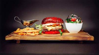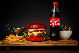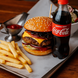 булочка красная , котлета говяжья ,сыр чеддер, помидор, огурцы маринованные, фирменнный соус бургер, подается с микс салатом и картофелем фри, coca-cola 0,5