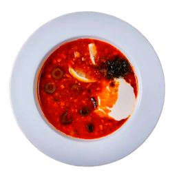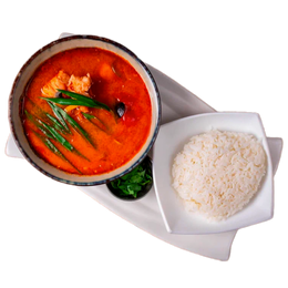 пряный суп с креветками,лососем и молоком кокоса,с добавлением мидий,болгарского перца,помидоров черри,шампиньонов и зеленого лука,подается с гарниром из рисаи перцем чили