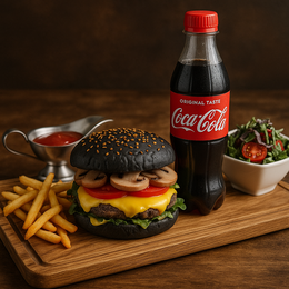 классическая булочка , котлета говяжья, сыр чеддер,сыр моцарелла,помидор,лист салата, фирменнный соус бургер, подается с микс салатом и картофелем фри , coca-cola 0,5