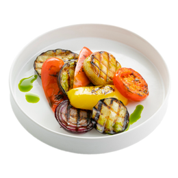 Овощи обжареные на гриле. Перец болгарский , баклажаны , кабачки , лук репчатый , помидоры черри