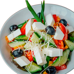 огурцы,помидоры,маслины,перец болгарский,сыр фетакса,листья салата,масло оливковое,подается с долькой лимона