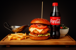 булочка желтая , куриное филе в панировке,соус кисло-сладкий, фирменнный соус бургер,сыр чедерр, подается с микс салатом и картофелем фри , coca-cola 0,5