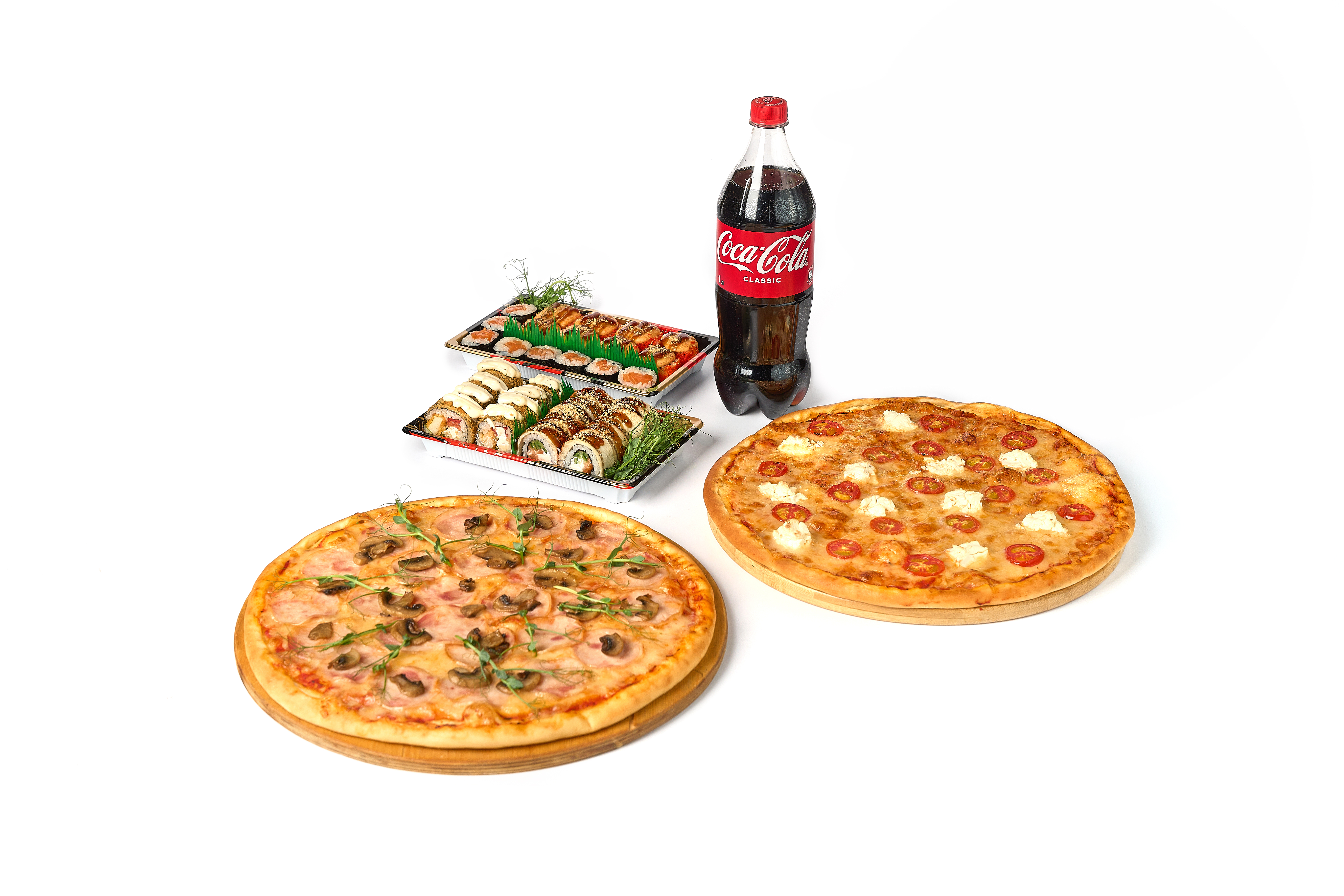 Пицца Маргарита 32 см, пицца Паола 32см, ролл Канада, ролл Самура, ролл Цезарь Темпура, ролл хосомаки Лосось, Coca-Cola 1 l