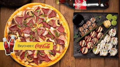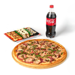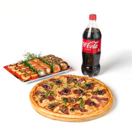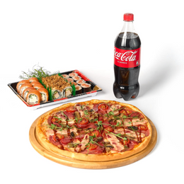 Пицца мясное удовольствие 37см, ролл Самура, ролл Цезарь, хосомаки угорь, Coca-Cola 1 l
