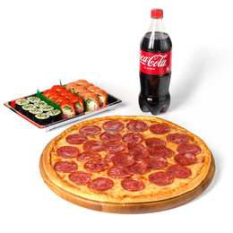 Пицца Пепперони 37 см, ролл Филадельфия, ролл Калифорния Surimi Хосомаки огурец,Coca-Cola 1 l