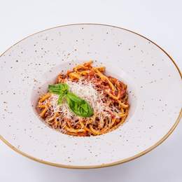 Паста твердых сортов, фарш из говядины, лук, морковь, стебель сельдерея, томаты пилати, базилик, пармезан.