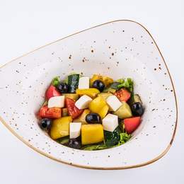 Лист салата, айсберг, помидор, огурец,, перец болгарский, маслины, сыр фетакса, соус масленый на основе соевого соуса.