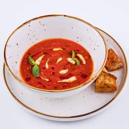 Томаты пилати, лук, чеснок, базилик, томат, сливки, гренки.