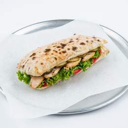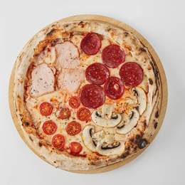 Cыр, пицца соус, помидоры черри, копченая индейка , свежие шампиньоны, колбаса копченая, масло оливковое
