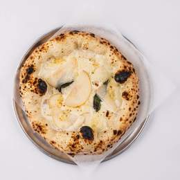 Неополитанское тесто, сливки, моцарелла, базилик, дор блю, груша.