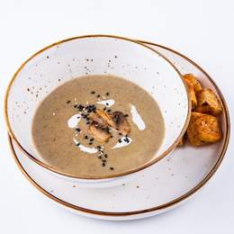Шампиньоны, картофель, лук, сливки, микс кунжута, гренки.