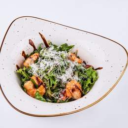 Лист салата, руккола, креветки, черри, огурец, масло оливковое, крем бальзамический, пармезан.