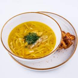 Куриный бульон, куриное филе, лапша кеспе, морковь, лук, зелень, гренки.