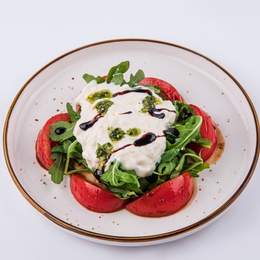 Помидоры, руккола, страчителла, крем бальзамический, песто.