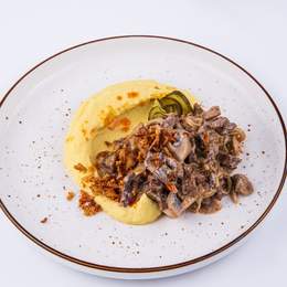 Картофельное пюре, филе говядины, шампиньоны, лук, сливки, малосольные огурцы, жареный лук
