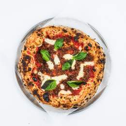 Неополитанское тесто, конина жая, страчителла, вяленые тооматы, слайсы миндаля, шпинат, соус песто